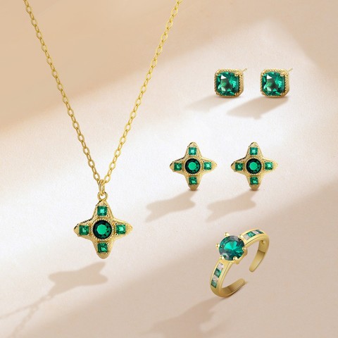 S925スターリングシルバーヴィンテージクロス女性用グリーンジルコンジュエリーセット女性用ジュエリーセット